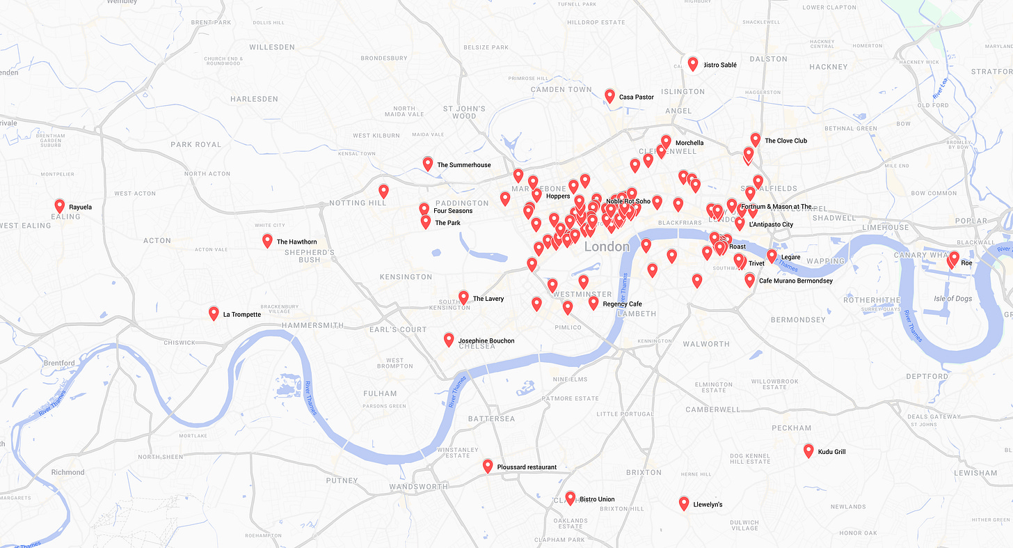 There’s a Google Maps custom map with all of the restaurants from the guide. I can’t embed it, annoyingly, but you can explore it here.