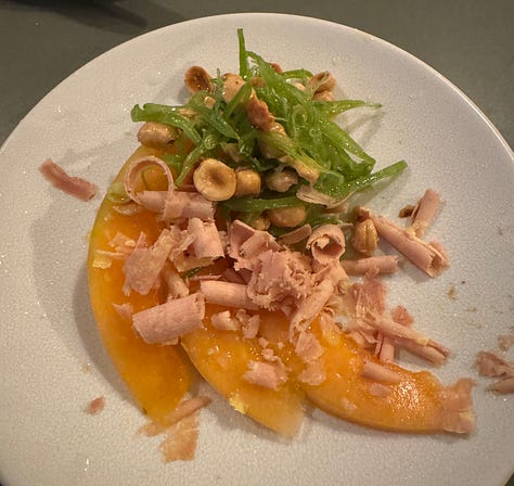 And then there was a combination I’d not experienced before: Foie gras grated over “Sun sweet melon” and served with hazelnuts. In this form the foie gras was basically a seasoning. It was a huge success.