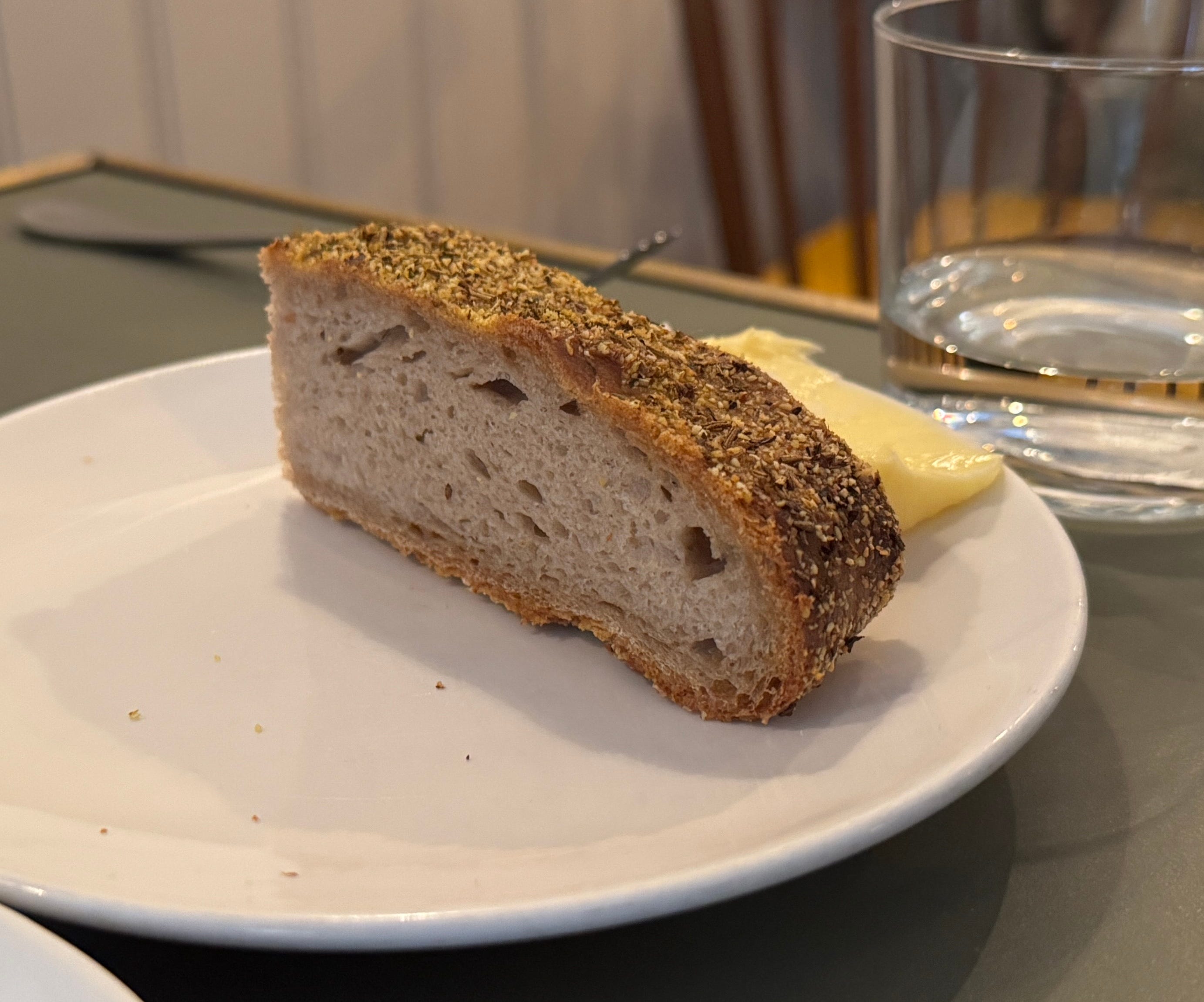 Let me start with the bread. In Leroy days, sourdough was bought in fresh, daily, from a nearby bakery. But to be true to the concept, and to ensure all the bread was oven fresh to the table, Shand spent two weeks developing his own receipt for Alpine fougasse, a seeded and herbed flatbread. He’s now serving the 15th variation, and it’s genuinely one of the best, most flavoursome forms of bread that I have ever eaten.
