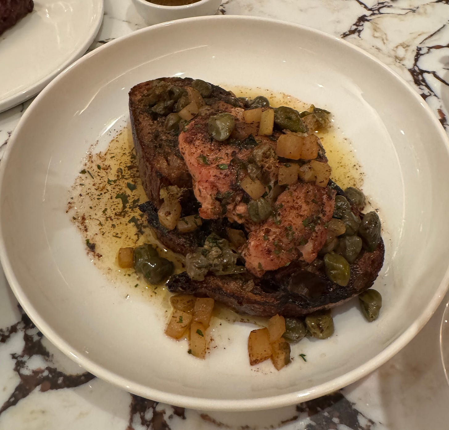 The sweetbreads were next level. Grenobloise is a lemon, caper, and brown butter sauce, poured liberally over the sweetbreads and a couple of slices of homemade bread. It was a rich bowl of buttery goodness, sure to make a cardiologist blush.