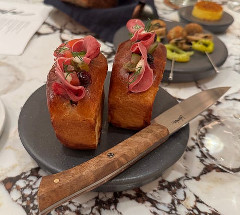 Happily, the list features Jonny’s “Hot tongue bun,” which I experienced at Trivet on my very first visit in November 2019. I was with two friends. We had been out for a long lunch and were, shall we say, a little tipsy. We had a few more glasses of wine in Trivet’s bar, and ate about seven tongue buns. They are truly among my favourite ever dishes anywhere, and definitely the best thing I have ever eaten on bread.