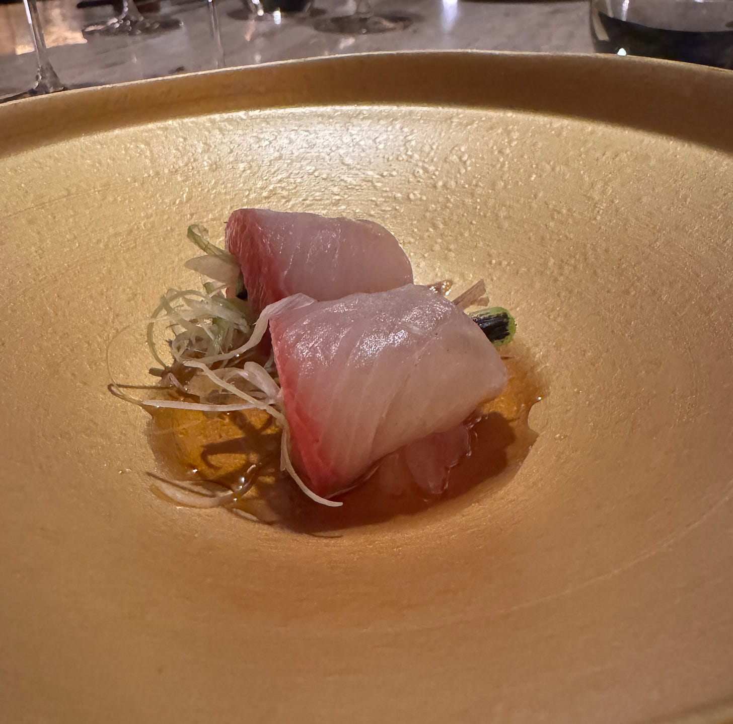 Hiramasa — yellowtail — is served as a play on sashimi. This was on the one slight technical miss of the evening. The fish was slightly too thick, and the green onion paired with mine was a bit too strong. But a topping of “grated soy” was a revelation, giving balance to the whole dish.