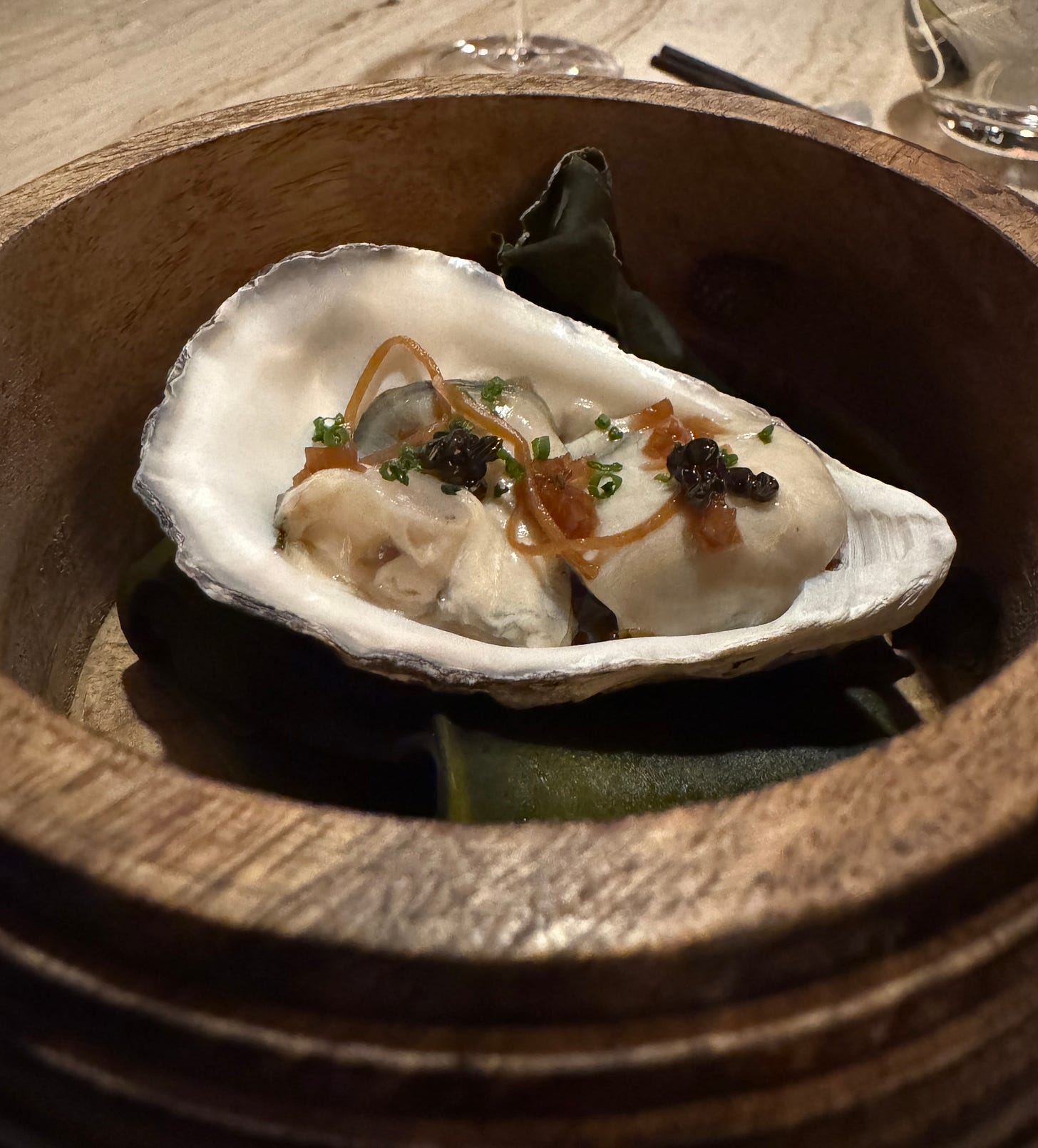Then the food starts to arrive, and any questions about vibe and authenticity vanish. Garvey and Pang offer a 14 course tasting menu — an even longer version is said to be in the offing — and invite you to lose yourself in your experience. The dishes and Sommelier Christian Vega’s wine and sake pairings make that easy.
