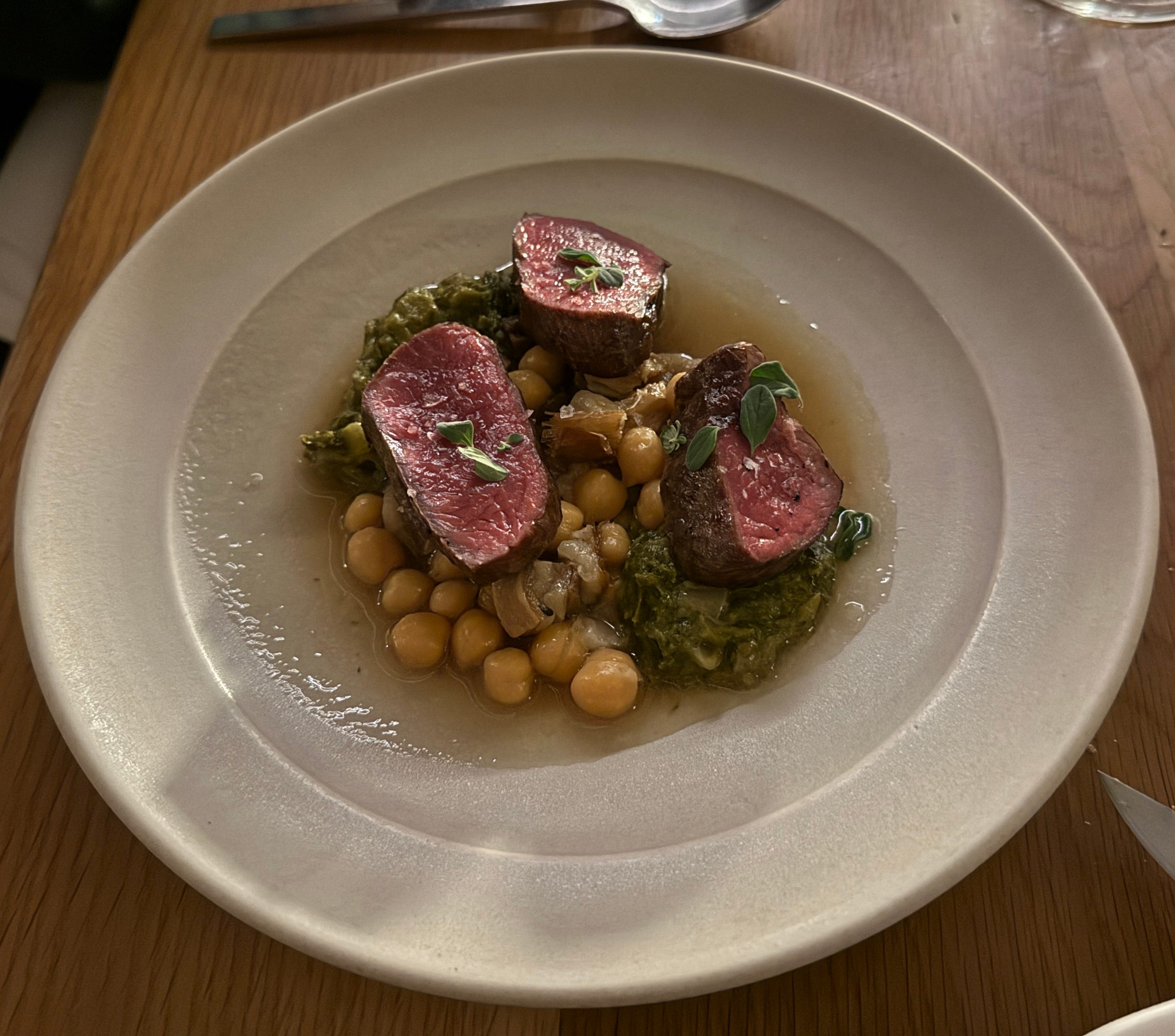 On the other hand, our mutton dish most definitely wasn’t. The sauce accompanying the mutton was made from “braised greens.” It tasted exactly like pot liquor, the remains of slow cooking big, course greens like collards or mustard greens for many hours. Where I grew up, pot liquor is served over cornbread, usually with white or pinto beans. Here, it was paired with chickpeas and the most tender, pink, meaty serving of mutton that I can imagine.